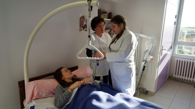 et une salle de travaux pratiques « Personnes âgées » avec un lit médicalisé, fauteuil roulant, lève-malade,….